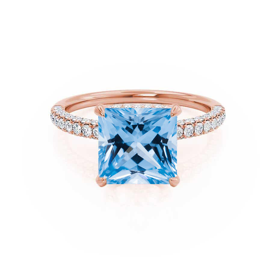 FREESIA – Lab-Grown Aqua Spinel & Diamond Engagement Ring in 18k Rose Gold Hidden Halo Triple Pavé Shoulder Set