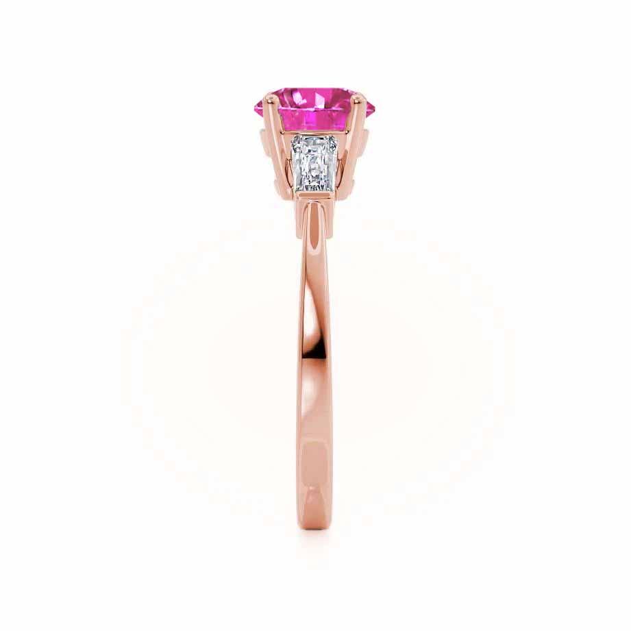 AZALEA – Round Lab-Grown Pink Sapphire & Baguette Diamond Trilogy Ring in 18K Rose Gold