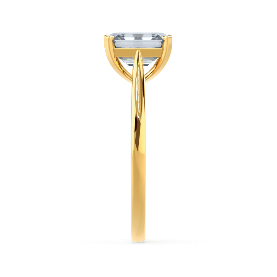 A timeless celebration of enduring love, this elegant solitaire engagement ring features a striking emerald-cut natural diamond, perfectly framed by a refined four-prong tapered mount. The elongated facets of the emerald cut capture light with quiet brilliance, while the minimal silhouette allows the stone’s clarity and geometry to take center stage. Crafted in luminous 18K yellow gold, this ring is the epitome of structured sophistication.