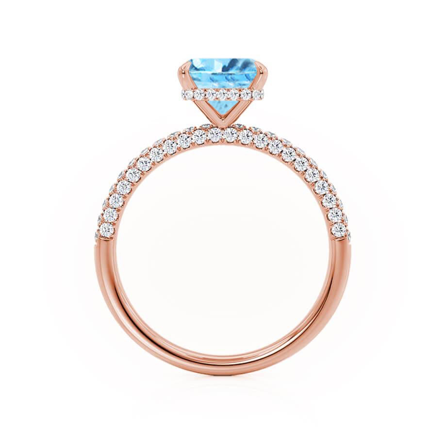 FREESIA – Lab-Grown Aqua Spinel & Diamond Engagement Ring in 18k Rose Gold Hidden Halo Triple Pavé Shoulder Set